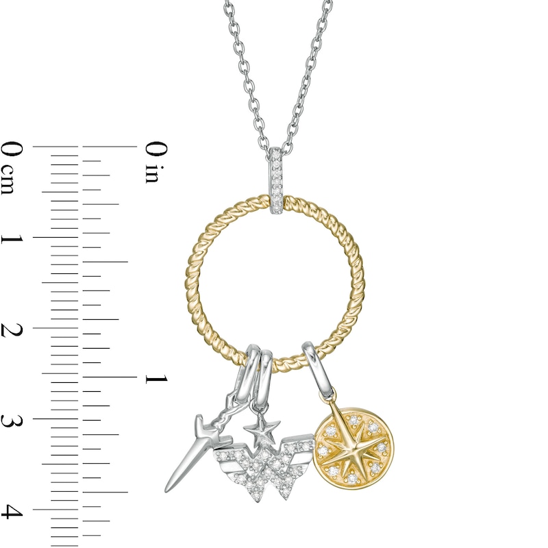 Created in sterling silver and warm 10K gold, this look showcases an open rope-textured circle gleaming in yellow gold. A trio of sculpted charms – a silver sword, a diamond-touched "WW" logo and a diamond-adorned star emblem in gold – add epic appeal. Radiant with 1/8 ct. t.w. of diamonds and a brilliant buffed luster, this pendant suspends from a diamond-lined bail along an 18.0-inch cable chain that secures with a spring-ring clasp.This exclusive fine jewelry collection inspires you to wear your strength, confidence and power.