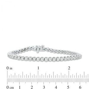Crafted in cool 10K white gold, this stunning bracelet features an interconnected square frame with sparkling round diamonds set into each prong. The diamonds weigh a total of 4 carats and are polished for a mesmerizing sparkle. This unique bracelet measures 7.0 inches long and secures with a tongue-and-groove clasp.
